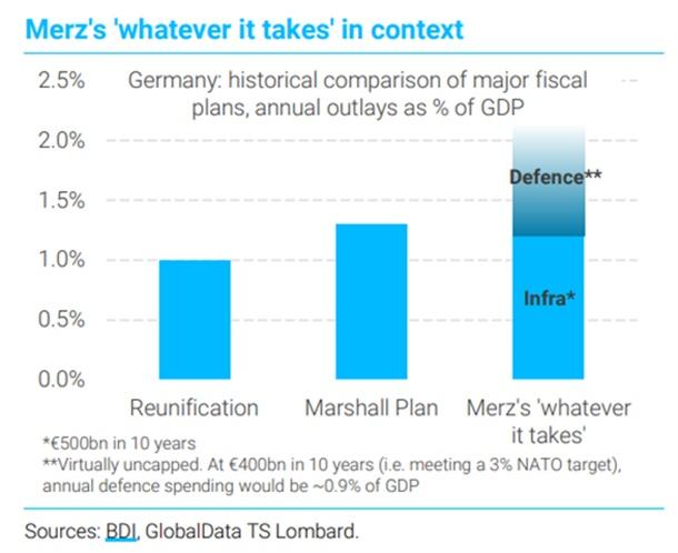 Les dépenses publiques annuelles dues au nouveau paquet fiscal allemand seront plus importantes que le boom des dépenses qui a suivi le plan Marshall d’après-guerre et la réunification de l’Allemagne au début des années 1990.