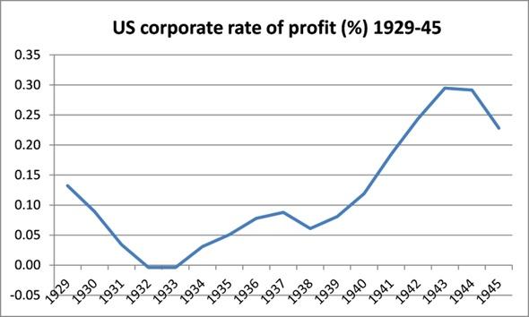 La Grande Dépression des années 1930 dans l’économie américaine a duré si longtemps parce que la rentabilité ne s’est pas redressée tout au long de la décennie. En 1938, le taux de profit des entreprises américaines était encore inférieur à la moitié du taux de 1929. La rentabilité ne s’est redressée qu’une fois l’économie de guerre en marche, à partir de 1940.