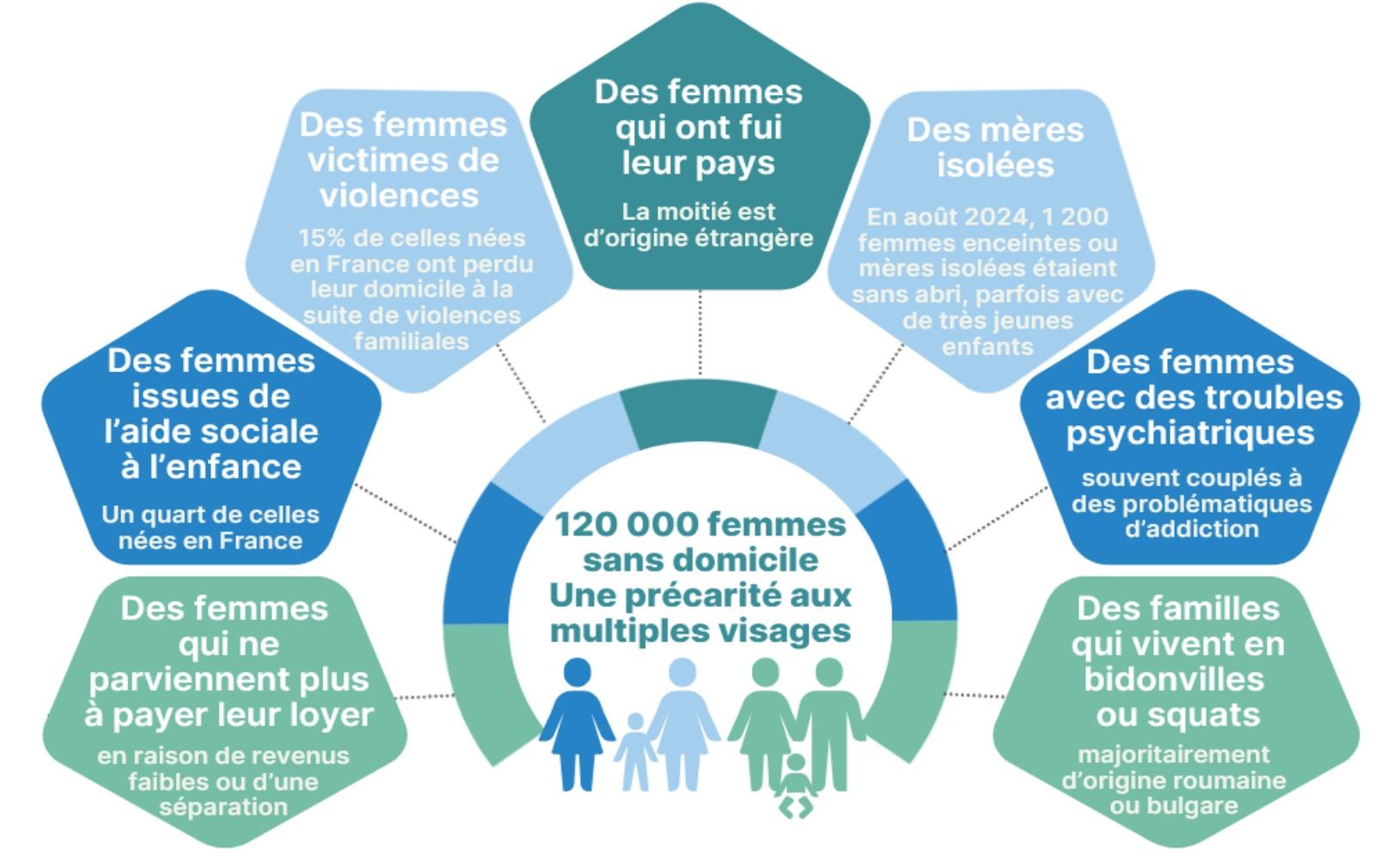 Chaque jour, en Ile de France, près de 2 000 demandes d’hébergement d’urgence sont non pourvues dont près de 1 000 sur Paris. C’est deux fois plus qu’il y a 10 ans. Les causes sont la paupérisation, la discrimination (baptisée officiellement « politique de l’immigration ») et le manque de logements sociaux. Faute de place, la préfecture restreint l’accès aux femmes enceintes de plus de 6 mois ou celles avec un bébé de moins de 3 mois. Bon nombre de femmes sont maintenues dans des centres d’hébergement parce qu’elles ne peuvent postuler à un logement en l’absence de titre de séjour régulier. La situation est extrêmement préoccupante à Paris, en Seine Saint Denis, dans le Nord, la Haute-Garonne, l’Hérault mais également à la Réunion et à Mayotte.
